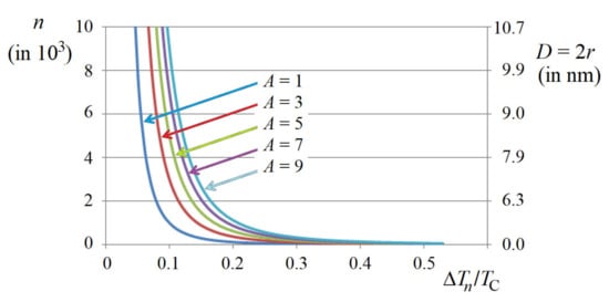 (Color online). Temperature dependence of the PNR size shown by the number of centers n (in 103, left scale), and the diameter of its spherical form D (in nm, right scale), as a function of the crystal parameter A (reproduced with permission from [7]. Copyright 2018, American Physical Society).