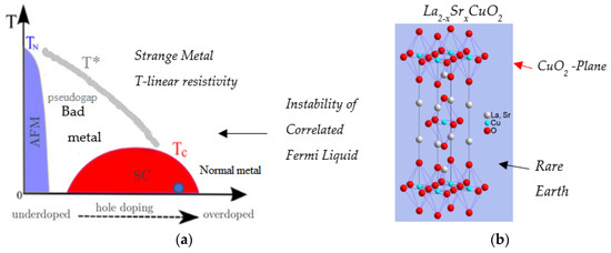 Let me recall the general properties of the cuprates by referring to their generic phase diagram (Figure 1a). All these materials are made up of copper–oxygen planes (CuO2), a quasi-bidimensional structure intercalated with layers of rare earth (lanthanum, yttrium, barium, etc., depending on the various families of cuprates, Figure 1b). In their stoichiometric composition (e.g., La2CuO4), these materials are antiferromagnetic (AF) Mott insulators, despite the fact that they have one hole per CuO2 unit cell in the copper–oxygen plane and should have been metals. Hence, there is the need for a strong correlation between charge carriers, holes in this case.
