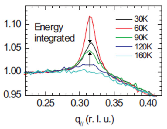 Adapted from [23]. Energy-integrated resonant X-ray scattering (RXS) for underdoped YBa2Cu3O6.6 (Tc = 61 K) as a function of the in-plane momentum vector at various temperatures. The arrows indicate the increasing or decreasing of the peak by lowering the temperature above or below Tc, respectively.