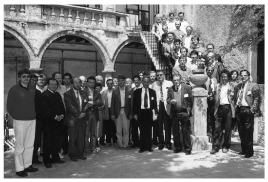 Actually, the community was and has been for decades strongly against the idea of phase separation and of non-uniform charge in general. Most researchers were referring to spin fluctuations due to the vicinity of the AF-QCP in the low-doped Mott insulator [4,19,40,41,42,43]. Charge order has been at most considered as a byproduct of spin order. For instance, at the first big international conference on HTSCs of 1988 held in Interlaken, following my remark on the possible interconnection between different charge density values that could coexist in these materials [44], P.W. Anderson argued that “simple calculations” show it to be impossible. Alex Müller, instead, trusted us from the beginning, and gave a strong support to the community that was inquiring about charge inhomogeneity in cuprates. He organized several conferences on PS (see, e.g., Erice in 1992 (Figure 5 and Figure 6) and Cottbus in 1993).