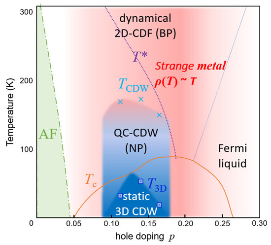 In the presence of a sufficiently high magnetic field to suppress superconductivity, a static 3D transition is unveiled (blue region in Figure 4), mainly in YBCO, by NMR [29,30], quantum-oscillation, negative Hall, and FS reconstruction [31,32,33,34,35,36,37,38], and finally by thermodynamic 3D transition by pulsed ultrasound [39]. Zero field QC-CDW and 3D long-range charge order with two QCPs (pc’ < pc ≠ pc0 ≈ p*) have the same in-plane incommensurate vector qc, suggesting a common origin.