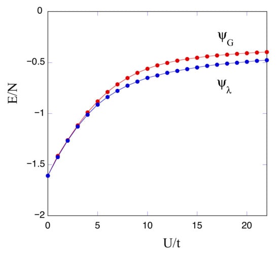 - Otsuka, H. Variational Monte Carlo studies of the Hubbard model in one- and two-dimensions. J. Phys. Soc. Jpn. 1992, 61, 1645. [Google Scholar] [CrossRef]