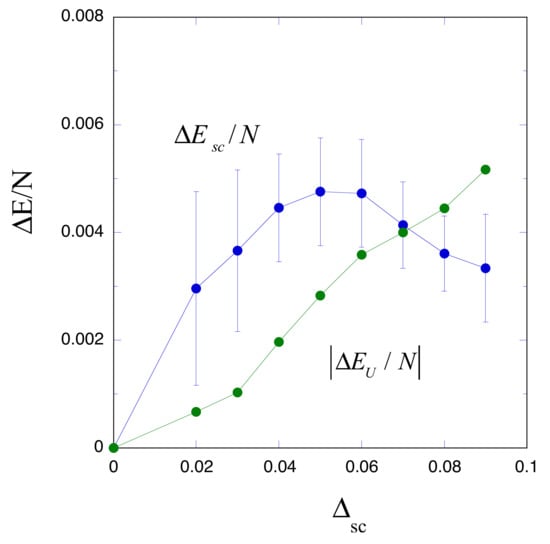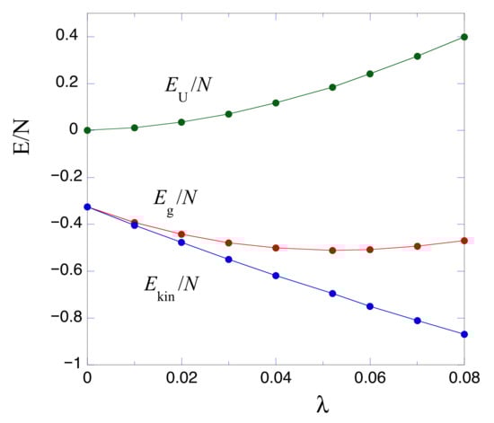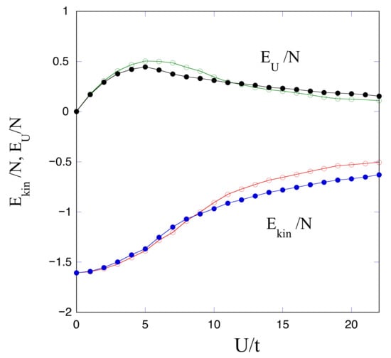 The expectation values are calculated numerically by using the auxiliary field method following a Monte Carlo algorithm [,]. We show the ground-state energy per site as a function of U for and in Figure 1. The energy is lowered due to the exponential factor . In the region of large U, the energy lowering mainly comes from the kinetic energy gain, as shown later.