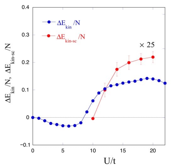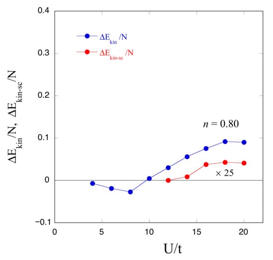 Kinetic-energy difference and the kinetic energy difference in the SC state () as a function of U on a lattice. Since is small compared to , we multiplied by 25. The boundary conditions are the same as in Figure 1. The electron number is () and we put .