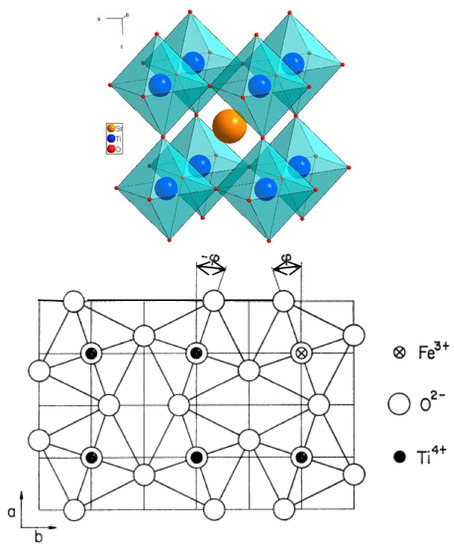In the early 1950s, the investigations of perovskites were enormously intense, since their ferroelectric properties were relevant for novel industrial applications. Understanding the background for the appearance of these phenomena intensified the experimental and theoretical activities and lead to new tools, like neutron scattering, nuclear and electron (para)magnetic resonance (NMR, EPR), and low-temperature techniques. These techniques evidenced that the ferroelectric perovskites have unique properties related to their dynamics, namely a distinct soft mode behavior of a long wave length transverse optic mode, where the related frozen-in ionic displacement pattern determines the low temperature structure and the magnitude of the polarization [2,3,4]. Thus, a unique characterization of ferroelectrics was possible through the identification of a soft optic mode. Besides the polar properties, further structural phase transitions were discovered, where, especially, SrTiO3 [5], LaAlO3 [6], and BaTiO3 were of uttermost interest. In the former two compounds, phase transitions from cubic to tetragonal, cubic to , were observed and believed to be characteristic for oxide perovskites [5]. The origin of these transitions remained unknown, however, for a decade, as well as their precise transition temperatures. This issue was clarified by K.A. Müller et al. in 1968 [7], who showed that the rotation angle φ of the oxygen ion octahedra is the order parameter of these phase transitions (see Figure 1, where the perovskite structure and the rotation of the octahedra are schematically illustrated).