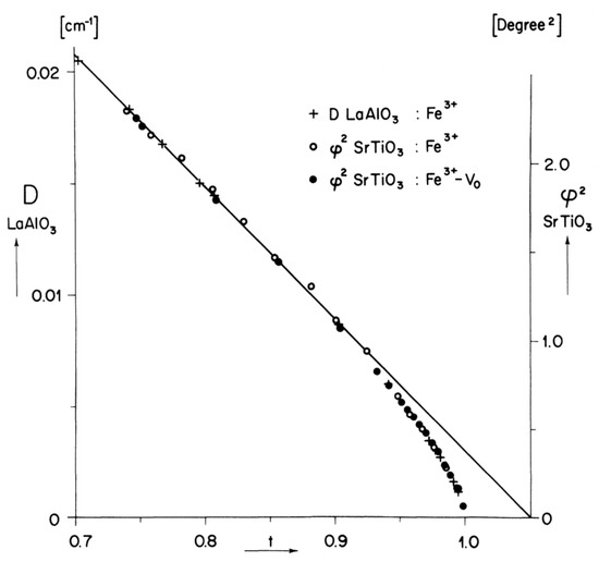 He identified this assignment via electron paramagnetic resonance (EPR) experiments where tiny amounts of a magnetic ion (e.g., Fe as indicated in the lower part of Figure 1) were implanted in the respective samples. By comparing the normalized rotation angles of different perovskite oxides, he concluded that, indeed, a unique similarity between them was present, since the temperature dependence of the rotation angle follows one single law independent of the corresponding compound. Since the rotation angle continuously goes to zero upon approaching the phase transition temperature, the transition has been classified as second order type.