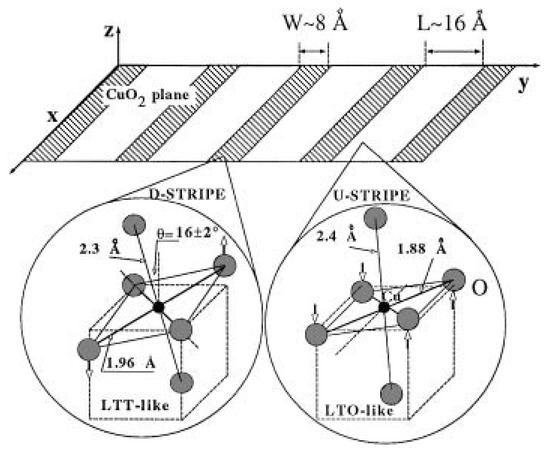 Pictorial view of the distorted CuO octahedra, left side, of the “LTT (low-temperature tetragonal) type” assigned to the distorted stripe (D stripes) of width Å and of the undistorted octahedra, right side, of the “LTO (low-temperature orthorhombic) type” assigned to the undistorted stripes (U stripes) of width Å. The superlattice of quantum stripes of wavelength is shown in the upper part (from Reference [54]).