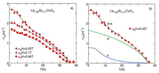 As an example, Figure 6a shows the temperature dependence of the μSR relaxation rate for single-crystal La1.83Sr0.17CuO4 measured in various external magnetic fields perpendicular to the CuO2 plane [63]. In this case, , where is the in-plane magnetic penetration depth. Note that shows an inflection point at low temperature which is most pronounced in the lowest magnetic field of μ. By analyzing the μSR data within a two-component model with coupled -wave order parameters, a good agreement between experiment and theory was achieved [63,67], as demonstrated in Figure 6b. In particular, it is evident from the analysis that the s-wave gap contributes less to the superfluid density (32%) as compared to the d-wave gap (68%), but that its contribution is essential in order to describe the μSR data consistently. The fact that various cuprate families exhibit essentially the same behavior of the μSR relaxation rate [63,64,65] suggests that this behavior is generic to all cuprate superconductors and reflects also the intrinsic inhomogeneity of these materials [45,69].