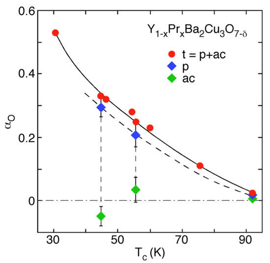 Total (t) and partial (p, ac) oxygen-isotope exponent as a function of for YPrBaCuO (t = total: all oxygen sites, p: planar oxygen sites, ac: apex and chain oxygen sites). Solid and dashed lines are guides to the eye (after Reference [78]).