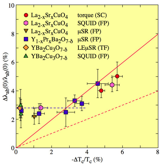 - Uemura, Y.J.; Luke, G.M.; Sternlieb, B.J.; Brewer, J.H.; Carolan, J.F.; Hardy, W.N.; Kadono, R.; Kempton, J.R.; Kiefl, R.F.; Kreitzman, S.R.; et al. Universal Correlations between Tc and ns/m* (Carrier Density over Effective Mass) in High-Tc Cuprate Superconductors. Phys. Rev. Lett. 1989, 62, 2317–2320. [Google Scholar] [CrossRef]