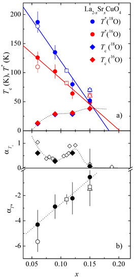 In addition, we performed OIE studies on microcrystals of underdoped LaSrxCuO4 with and (volume by means of high-sensitive torque magnetometry [89]. A substantial OIE on was observed, namely for and −8(1)% for , respectively, in agreement with the results obtained for fine-grained powder samples [76,88].