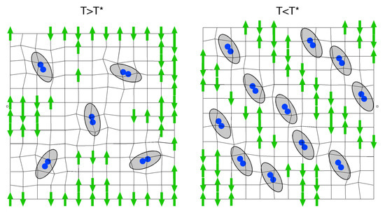 Disordered bipolaron gas above (left) and ordered bipolaron liquid below (right) (from Reference [67]).
