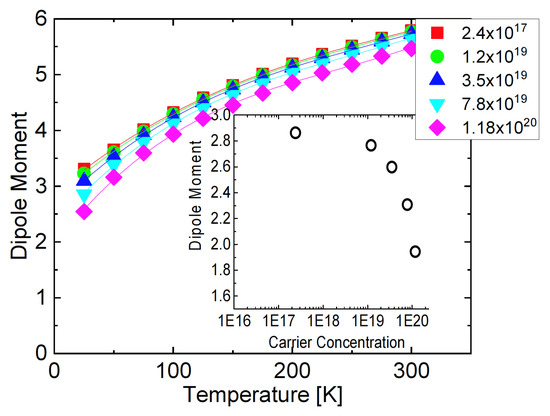 As is obvious from the figure, this local mode softens with decreasing temperature and simultaneously moves to lower momentum values but never reaches the long wave length limit. In addition, the softening slows down with increasing carrier concentration, and its momentum space spread increases, highlighting the growing spatial confinement of these polar nano-domains. In contrast to a long wave length “true” soft mode, it is not linearly dependent on temperature but substantially nonlinear below . Since , this mode is directly linked to the dielectric permittivity , which is reduced by approximately 40% as compared to the long wave length limit, but still exhibits an appreciable temperature dependence which is typical for an almost ferroelectric compound [127]. From the calculated thermal average of the displacement-displacement correlation function, a local dipole moment has been derived, which decreases with decreasing temperature and increasing carrier concentration (Figure 13), where the inset shows the zero temperature limit of it in dependence of the carrier concentration.