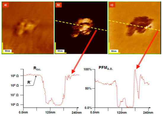 Topographic image of the exit of a dislocation bundle in thermally reduced SrTiO: (a) the topography variation is about 0–4.8 nm. In the area of the bundle (local conductivity atomic force microscopy (LC-AFM)) (b) with metallic properties, the piezo response (c) is absent. This can be observed at the cross sections of LC-AFM (b) and piezoelectric force microscopy (PFM) (c) responses. The distribution of the resistance along the cross section (lower part of the figure) shows an anti-correlation with the distribution of the piezo activity on the cross section of the PFM. The resistance outside the bundle is much higher than on the cross section, which is related to the finite resolution of the analog-to-digital converters (here, 4 decades), so that, using additional measurements (only in this area), the resistance is higher than 10 (from Reference [127]).