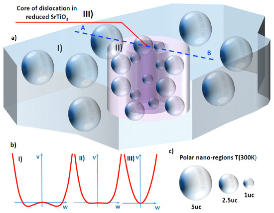 (a) Schematic representation of the structural and chemical development along a pathway from A to B crossing a core of dislocations in SrTiO. (b) The change of the local potential along the same pathway where in the region I) an intact matrix is present, while, in II), a crossover region exists with flat potential, which changes over to single well in III), where the metallic properties of the dislocation core dominate. (c) Sizes of the polar nano-regions (uc: unit cell) (from Reference [127]).