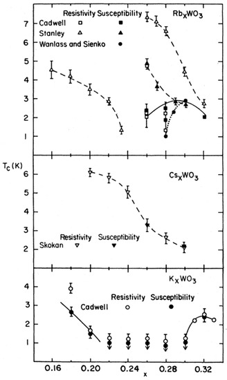 Superconducting transition temperature as a function of x for RbWO, CsWO, and KWO (from Reference [135]).