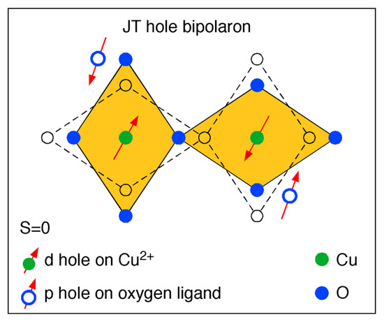 In order to come back to the starting ideas leading to high-temperature superconductivity, we finish our conclusions with the final Figure 17, the Jahn-Teller bipolaron [55,147], which is the essential ingredient and motivation for the discovery of high-temperature superconductivity [49,50,51,52].