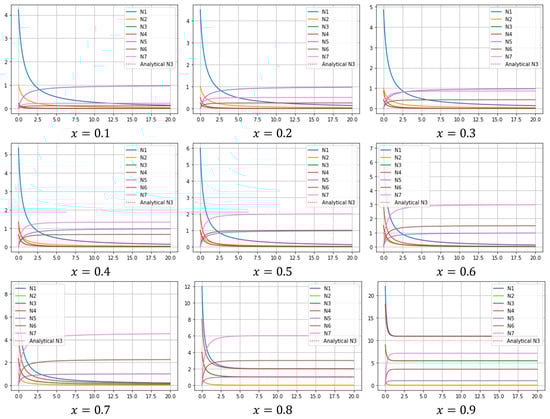 Instead, below, we solve the system of ordinary differential Equations (38)–(44) with initial Conditions (45)–(51) numerically at and; then, to check the correctness of the analytical Solution (55), we calculate that solution at discrete values of obtained numerically. After that, we build an inverse plot, the discrete set of values calculated by Equation (55) vs. these discrete values of , together with the numerical solution for . If Solution (55) is correct, these two plots must coincide in the frames of numerical calculation errors.