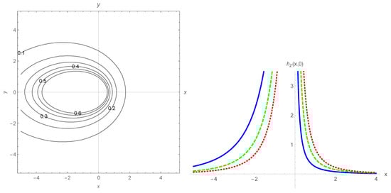 The left panel: contours of const ( is in units and in units of ) for . The right one: for (dotted red), (dashed green), and (solid blue).