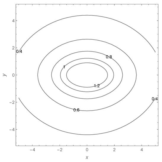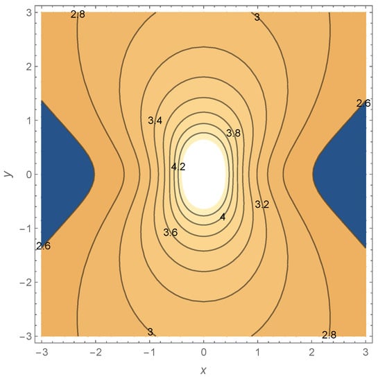 Contours of constant dissipation in the system of two moving vortices for . At one is situated at the origin and the second at .