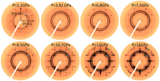 Diffraction patterns as a function of pressure. We observe a well-defined tetragonal structure at low pressures, with diffuse stripes that indicate a fluctuating 1D linear oxygen ordering along the two tetragonal axes [7]. Above 8 GPa, we observe the appearance of superstructure spots (indicated by light green and white circles). They become more intense and diffuse at very high pressures.
