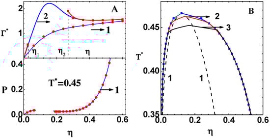 Figure 1. (A) Upper part shows Γ * ( 1 ) versus η from CPE of 20th order for T * = 0.5 (curve-1), T * = 0.4 (curve-2), and exact results (symbols). The range η 1 < η < η 2 is the ‘no-real-solution-region’ for T * = 0.4 . Lower part of the figure for T * = 0.45 shows compressibility pressure P versus η , from CPE of 20th order (curve-1), and exact results (symbols). The blank portion is the ‘no-real-solution-region’. (B) The exact results for phase diagram of AHS model (blue line and symbols) are compared with those obtained using a CPE of 50th order (curve-2) and 20th order (curve-3). The ‘no-real-solution-region’, lying within the dashed lines (curve-1), is also shown.