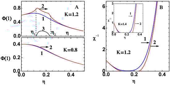 Figure 2. (A) Lower part (for K = 0.8 , ζ = 2 ) shows Φ ( 1 ) versus η obtained from CPE of 20th order (curve-1) and the exact results (curve-2). In the upper part (for K = 1.2 , ζ = 2 ) , the range η 1 < η < η 2 is ‘no-real-solution-region’, as K * = 1.1354 . Graphs show Φ ( 1 ) versus η obtained from CPE of 20th order (curve-1) and real (curve-2) and imaginary (curve-3) parts of the exact results. (B) Graphs show (reduced) inverse compressibility χ 1 versus η obtained from CPE (curve-1) and exact results [11] (curve-2) for K = 1.2 . The inset figure is similar, but it is for K = 1.4 .