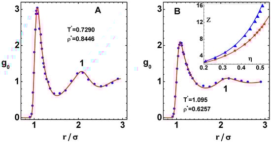 Figure 3. (A) Pair distribution function g 0 ( r / σ ) versus scaled distance ( r / σ ) (curve-1) for the reference system of LJ potential, as per the WCA prescription (see text), at reduced temperature T * = 0.7290 and density ρ * = 0.8446 . Symbols are molecular dynamics simulation results [32]. (B) Similar results for the parameters T * = 1.095 and density ρ * = 0.6257 . The inset figure shows compressibility factor Z = β P / ρ versus volume fraction η = π ρ * / 6 for reduced temperature T * = 0.75 (top curve) and T * = 2.0 (bottom curve). Symbols are simulation results [33].