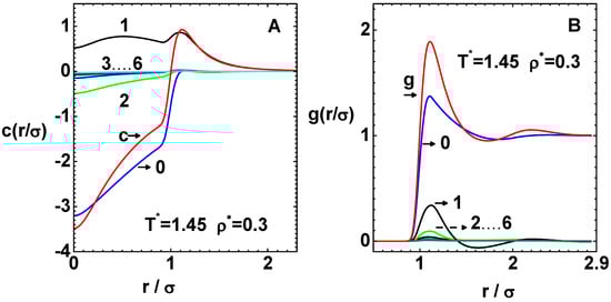 Figure 4. Convergence of direct correlation function c ( r / σ ) and pair distribution function g ( r / σ ) for the LJ system at the phase point ρ * = 0.3 and T * = 1.45 , which is above the critical temperature. (A) Graphs show c ( r / σ ) (curve-c), reference function c 0 ( r / σ ) (curve-0), and successive derivative terms c n ( r / σ ) / n ! (curve-1 to curve-6). (B) Similarly, the graphs show g ( r ) (curve-g), reference function g 0 ( r / σ ) (curve-0), and derivative terms g n ( r / σ ) / n ! (curve-1 to curve-6) for the same phase point.