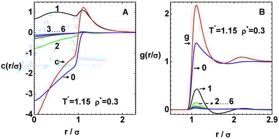 Figure 5. Convergence of direct correlation function c ( r / σ ) and pair distribution function g ( r / σ ) for the LJ system at the phase point ρ * = 0.3 and T * = 1.15 , which is in the spinodal region. (A) Graphs show c ( r / σ ) (curve-c), reference function c 0 ( r / σ ) (curve-0), and successive derivative terms c n ( r / σ ) / n ! (curve-1 to curve-6). (B) Similarly, the graphs show g ( r / σ ) (curve-g), reference function g 0 ( r / σ ) (curve-0), and derivative terms g n ( r / σ ) / n ! (curve-1 to curve-6) for the same phase point.