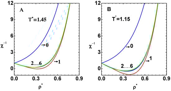 Figure 6. Graphs show inverse compressibility χ 1 versus reduced density ρ * obtained at successive orders of series expansion. Thus, χ 1 calculated with just c 0 ( r / σ ) (curve-0), c 0 ( r / σ ) + c 1 ( r / σ ) (curve-1), c 0 ( r / σ ) + c 1 ( r / σ ) + ( 1 / 2 ) c 2 ( r / σ ) (curve-2), etc., and finally c ( r / σ ) (curve-6) is shown. (A) Graphs for reduced temperature T * = 1.45 in one-phase region. (B) Similarly, for T * = 1.15 when crossing the spinodal region.