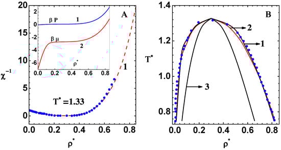 Before obtaining the phase diagram, it is important to check the accuracy of CPE results on an isotherm close to the critical point. This is conducted in Figure 7A, which shows χ 1 versus ρ * (curve-1) on isotherm for T * = 1.33 . The results of independent computations (symbols) are also shown [12]. The latter results are for identical models but are based on Newton’s method applied to the full potential, together with very careful strategies to mark out the spinodal region. The reduced temperature T * = 1.33 is just above the critical temperature T c * = 1.326 and was obtained via CPE, as discussed next. The agreement between the two sets of results is quite good, thereby demonstrating convergence of χ 1 profile in CPE even close to the critical point. The inset figure shows pressure β P (curve-1) and chemical potential β μ (curve-2) obtained via the compressibility route, i.e., by integrating χ 1 profile (see Equation (15)) from zero to ρ * . Nearly flat regions in these graphs over a range of ρ * show the closeness of the isotherm to the critical isotherm.