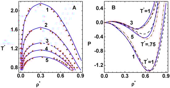 Figure 8. (A) Comparison of co-existence lines, obtained with CPE, for potentials: LJ(7,6) (curve-1), LJ(9,6) (curve-2), LJ(12,6) (curve-3), LJ(15,6) (curve-4), and LJ(20,6) (curve-5), with simulation data (symbols) [35]. (B) Reduced isotherms for LJ(7,6) (curve-1) using virial (solid line), compressibility (dashed line), and free energy (dash-dot line) routes corresponding to T * = 1 . Other sets of graphs are for LJ(12,6) (curve-3) at T * = 1 and LJ(20,6) (curve-5) at T * = 0.75 .