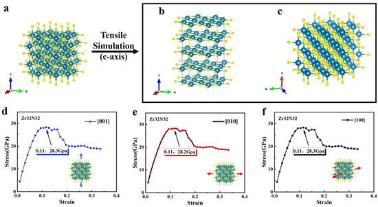 We first calculated the stress–strain relationship in the crystal direction of <001>, <010>, and <100>, which are shown in Figure 2. Figure 2a shows the initial structure of Zr32N32, while Figure 2b,c shows the front view and the top view of the structure after tensile strain (i.e., in the crystallographic direction of <001>). Apparently, the structure of Zr32N32 became longer after the simulation of tensile stain, but the arrangement of the atoms is still ordered. Then, different ratios of tensile distances in the lattice of Zr32N32 were applied. As is shown in Figure 2d–f, the same processes are performed on three mutually perpendicular crystallographic direction (<001>, <010>, and <100>), and the corresponding relationships between stress and strain are obtained. The maximum value in the stress–strain relationship reflects the tensile strength of the lattice in one of the crystal directions. In Figure 2d–f, the stress of Zr32N32 reaches its maximum value at a ratio strain of 0.11, indicating a corresponding ideal tensile strength of 28.2 GPa. As the strain continued to increase, there was no sudden drop in stress, indicating that the Zr32N32 did not fracture during the tensile process. In addition, it is clear that the stress–strain relationships of ZrN in the three crystallographic directions are almost identical, which is the result of the symmetry of ZrN.