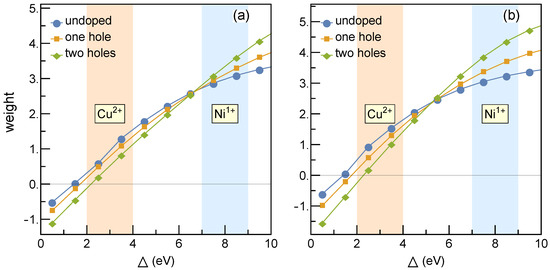 Doping tendency of NiO model as a function of crystal-field splitting : (a) ; (b) eV. (Blue) undoped, and ; (Orange) one hole doped, , ; (Green) two holes doped, , in NiO (CuO) cluster. The nickelate (cuprate) regime is highlighted in blue (orange). The model parameters are given in Table 1.
