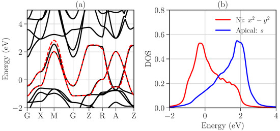 The two-band model is derived by performing a Wannier projection onto the DFT band structure as implemented within the Wannier90 interface [26], including onsite energies and hopping parameters of each Wannier orbital. The projection was performed onto a Ni() and an apical Ni(s) Wannier orbital within an energy window ranging from to eV. The DFT band structure, represented here by the projected Wannier bands and its density of states (DOS), are shown in Figure 2. Panel Figure 2a shows the DFT band structure (black lines) and Wannier bands (red dashed lines). The right panel Figure 2b contains the resulting Wannier DOS around the Fermi energy for the bands of two symmetries: and s. It is clear that the fit cannot be perfect and the electron/hole estimation is wrong, but this plays a minor role fr the questions asked here and our result qualitatively matches previous studies [12,20].