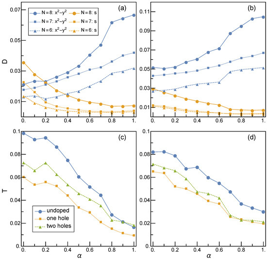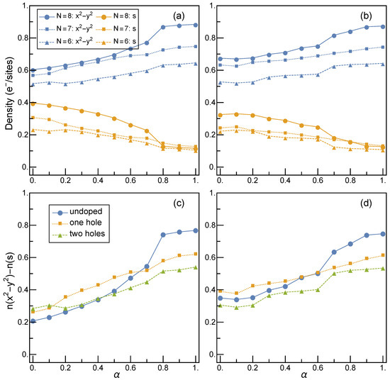 Orbital-resolved electron densities as obtained for: (a) set A, and (b) set B, see Table 3. Strongly anisotropic electron distribution over the and s orbitals is favored when the interactions are screened by , as shown for: (c) set A, and (d) set B.