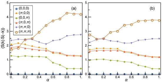 is shown in Figure 4. With this small cluster size we can observe only six relevant -points in the Brillouin zone and only simple types of AFM order can be investigated. As a universal feature, the spin structure factor at is enhanced as the orbital is close to forming a half-filled band; it indicates that G–AFM order is favored for electron doping [13], see Figure 4.