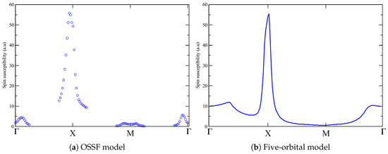 where is the momentum vector, is the inverse temperature, is the imaginary time, and is the bosonic Matsubara frequency. The spin operator in the orbital space for the orbitals is defined as with the Pauli matrices for the spin operator. Using this explicit definition of and applying Wick’s theorem to Equation (7), the noninteracting spin susceptibility can be rewritten as: