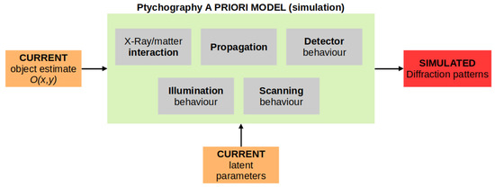 Typically, an iterative phase retrieval procedure [1] is employed to find a solution for [3]: an a priori image formation model is used to simulate the experiment, by producing synthetic quantities (Figure 1), which depend on the current estimate of all the latent variables, e.g., , and the model parameters; it is the comparison (loss function) between simulated and measured quantities that guides the solution, as the current estimate is iteratively updated (Figure 2) to minimise the error. In CDI/ptychography, the quantities of interest are diffraction patterns (Figure 1).