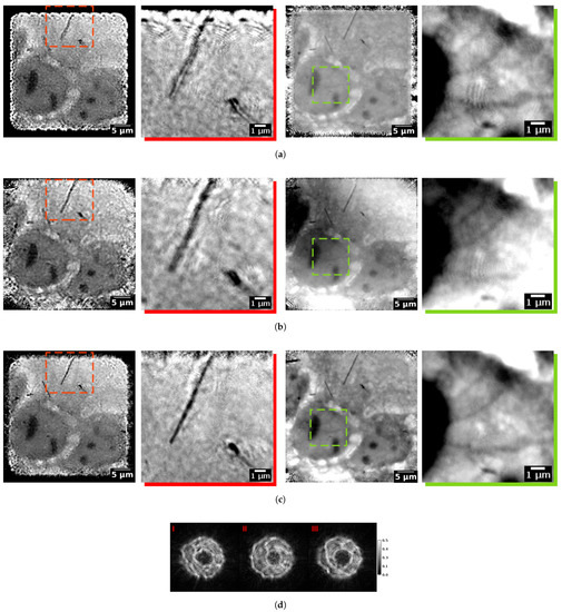 Observing the quality of the results, the proposed method (Figure 7) clearly surpassed all the aforementioned ones: Figure 7 shows the red insets of the top left fibre, which was correctly reconstructed with the highest resolution only by the proposed algorithm; in a multimode DM and EPIE reconstruction, many ringing artefacts are visible. RPIE [47] provided the best result among the typical reconstruction algorithms, with an object with a large field of view, which extended also into sparse sampled areas. The proposed method (fourth row) reconstructed the fibre and the cell at the highest resolution in both magnitude and phase (see Figure 8). A second inset (green colour) shows the texture in the phase reconstruction, where again, the proposed method outperformed the others; cell structures were corrupted by fewer artefacts and visible in their entire length.