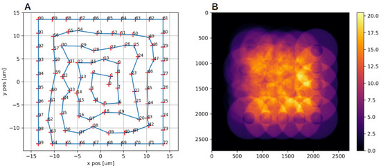 (Panel A) shows the final scan positions in micrometres. The corresponding sample density mask is represented in (Panel B), which denotes a high sampling density, especially in the centre (higher overlap).