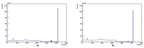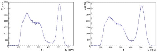 Since the simulated crystal volumes are relatively small, the X-ray following the photoelectric absorption close to the crystal surface may escape into neighboring or farther crystals, contributing to pixel cross-talk. To quantify this effect in both simulated configurations, we focused on the central pixel in the module and plotted its simulated (non-smeared) energy deposition (Figure 11). The peak around 450 keV in LYSO or 460 keV in GAGG corresponded to events where X-ray escape happened following the photo-electric absorption. The simulation was then utilized to count pixels with various distances, where the X-ray was subsequently absorbed. The results are summarized in Table 6. For LYSO, 4.6% of all photoelectric interactions in the crystal resulted in X-ray escape, and 2.3% for GAGG crystals. As can be seen from Table 6, most of these X-ray photons were absorbed in the adjacent pixels.