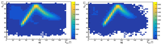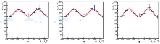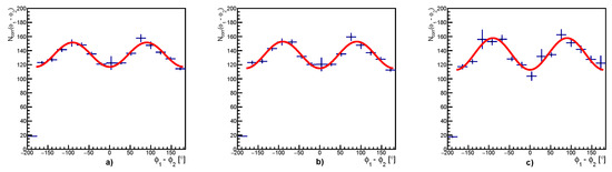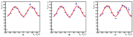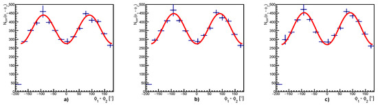 For the events where Compton scattering for both annihilation quanta was reconstructed, we extracted the distribution of the azimuthal angle difference , for a selected range of reconstructed angles , where 1 and 2 refer to modules 1 and 2, respectively. An example of such a distribution is shown in Figure 6a. However, the measured raw distributions were affected by the non-uniformity of the detector acceptance. The acceptance-corrected distribution can be obtained according to: