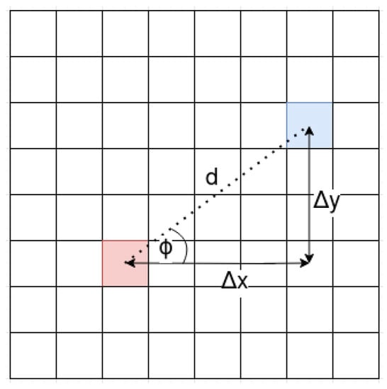 To reconstruct the azimuthal scattering angle in each module, the distances and between the first and second fired pixels in x and y directions, respectively, were calculated (Figure 5). Angle could then be obtained by using the formula: