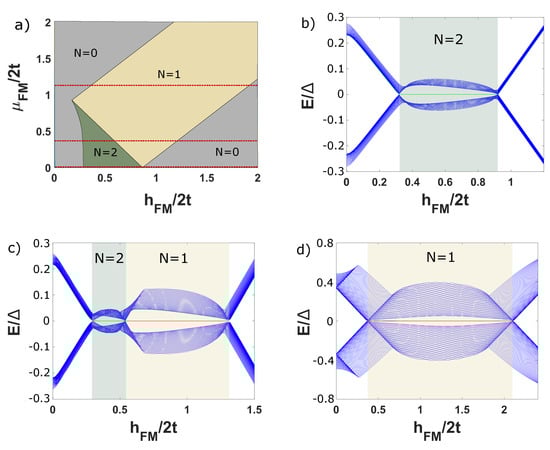 - Čadež, T.; Sacramento, P.D. Zero energy modes in a superconductor with ferromagnetic adatom chains and quantum phase transitions. J. Phys. Condens. Matter 2016, 28, 495703. [Google Scholar] [CrossRef][Green Version]