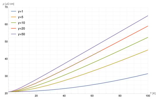 Plot of the resistivity as a function of temperature. Parameter values, when set, are 15 meV, eV/(r.l.u.), , 30 meV, and meV. Note that the resistivity value at 0 K is greater than zero and it is the same for all curves, as this value is determined solely by .
