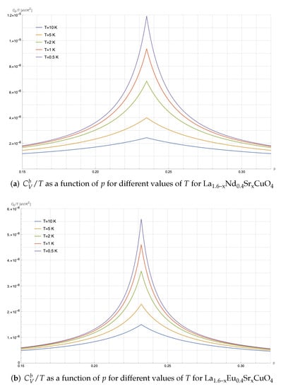 As we have already mentioned, several specific heat measurements, carried out in 2019 on some samples of La1.6−xEu0.4SrxCuO4 and La1.6−xNd0.4SrxCuO4, highlighted the presence of a thermodynamic singularity at the QCP, signaled by the fact that the ratio seems to diverge as at fixed [11]. In principle, such behavior could be due to fermion quasiparticles if their chemical potential approaches a van Hove singularity, which we know to be present close to the critical doping level. Nevertheless, the presence of disorder and the weak coupling between lattice planes strongly smoothen the singularity; hence, it was argued that the fermion quasiparticles alone are not able to account for the singularity.