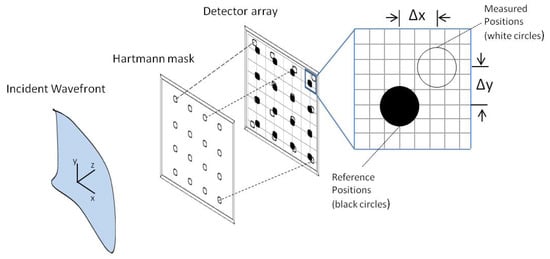Drawing of the Hartmann wavefront sensor operation. Showing an incident wavefront traveling along the z-axis illuminating an aperture array and the diffracted spots. The intensity and position of the diffracted spots are recorded by a detector. The displacement of a single diffracted spot (white circle) is compared with the reference location (black disk) on the detector.