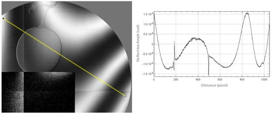 As previously explained, the detection process in the Hartmann sensor is based on the relative shift of each aperture position between one image taken without the sample (reference) and one acquired with the sample. In some cases, the projection of the Hartmann mask onto the detector grid generates moiré fringes. A moiré pattern is created by superimposing two patterns of regular geometry, such as two sets of evenly spaced lines or apertures []. To better understand the impact of moiré fringes, the full deflection image of the sample can be seen in Figure 2. The presence of black and white fringes deeply affects the image quality. For the single line plot reported on the right part of Figure 2, the signal coming from the sample is distorted by the moiré pattern. The deflection of the object is thus mixed with the artefact, complicating the image analysis.